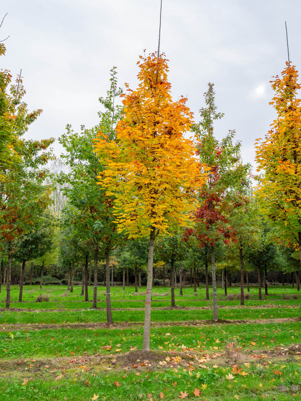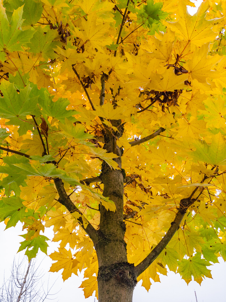 Listy stromu Acer platanoides 'Columnare' se změní v žlutá během podzimu.