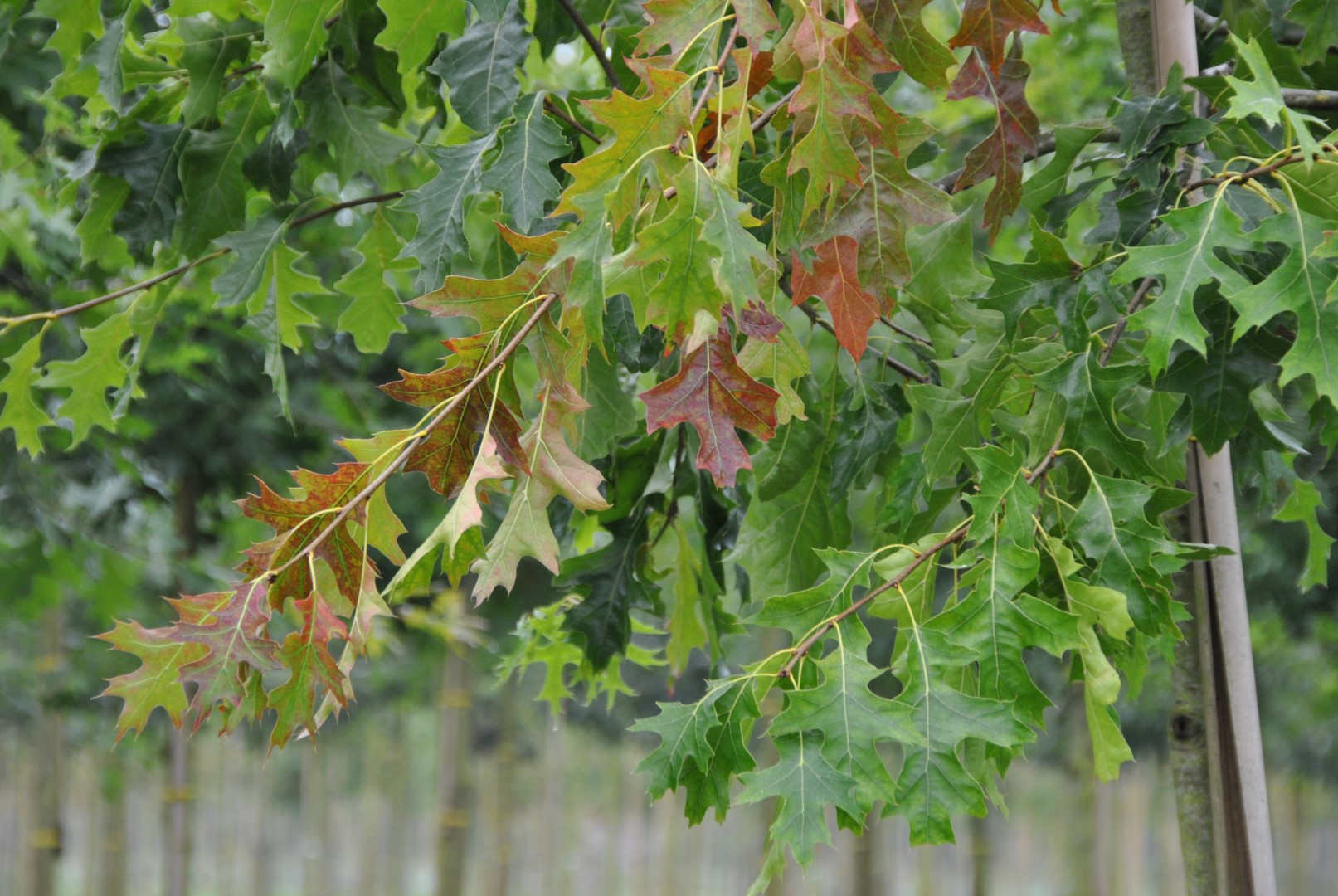 Listy stromu Quercus palustris 'Pendula' se změní v červená během podzimu.