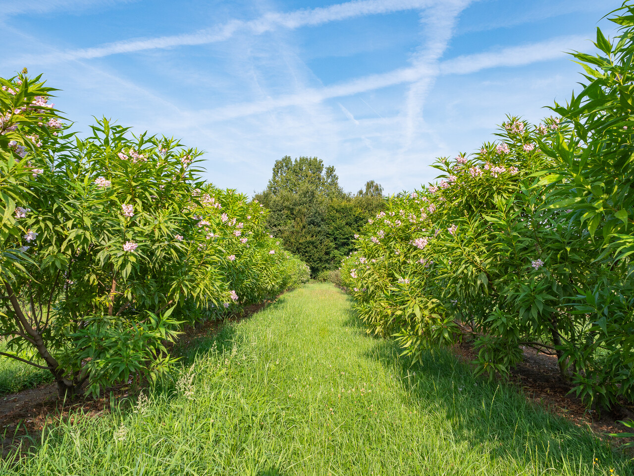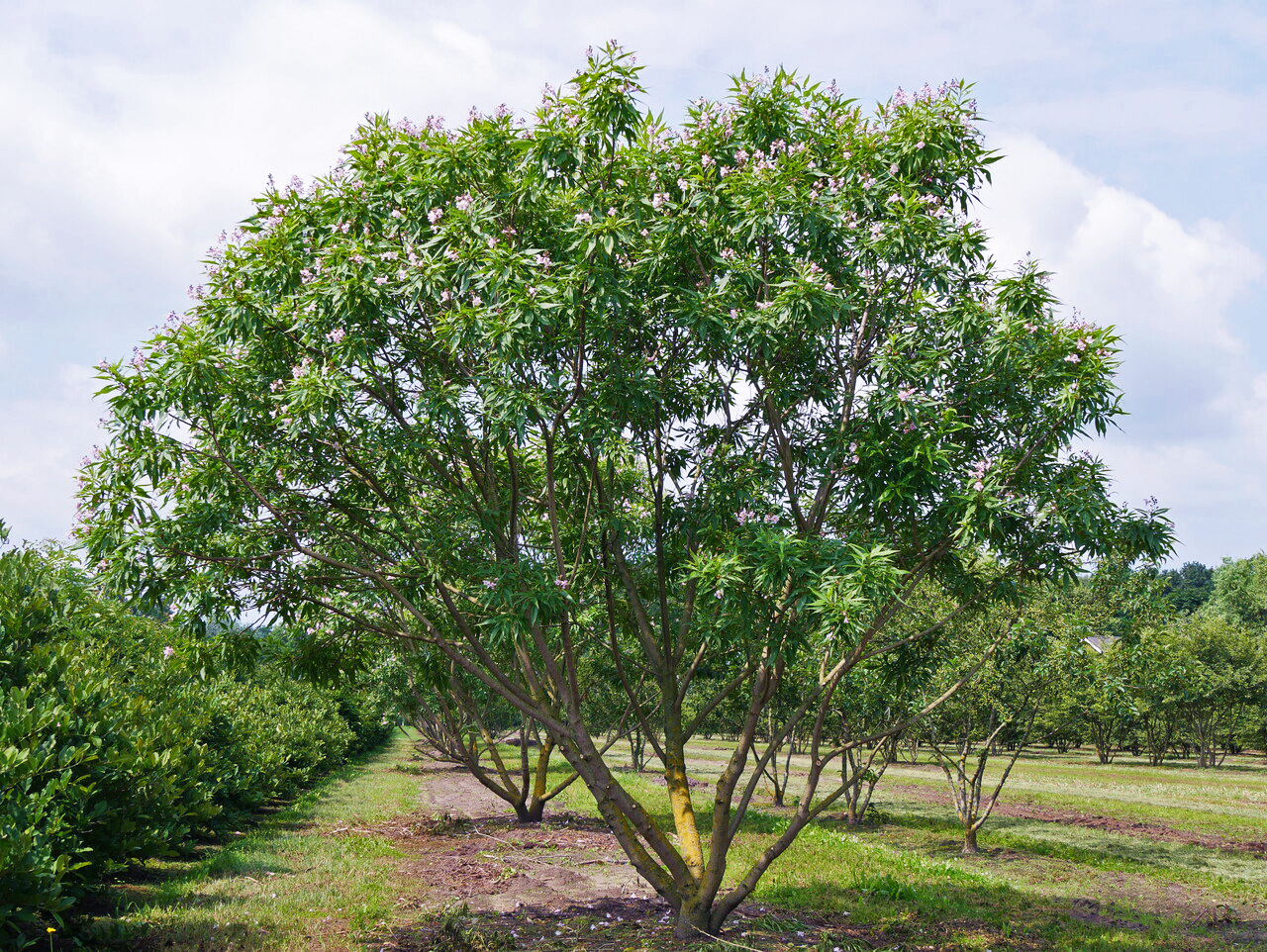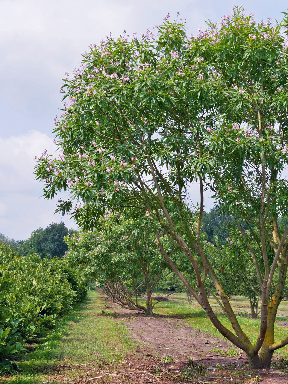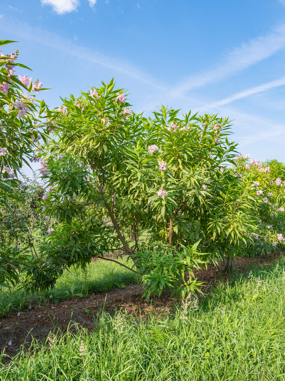 Chitalpa tashkentensis 'Summer Bells' kvete v červen, červenec.
