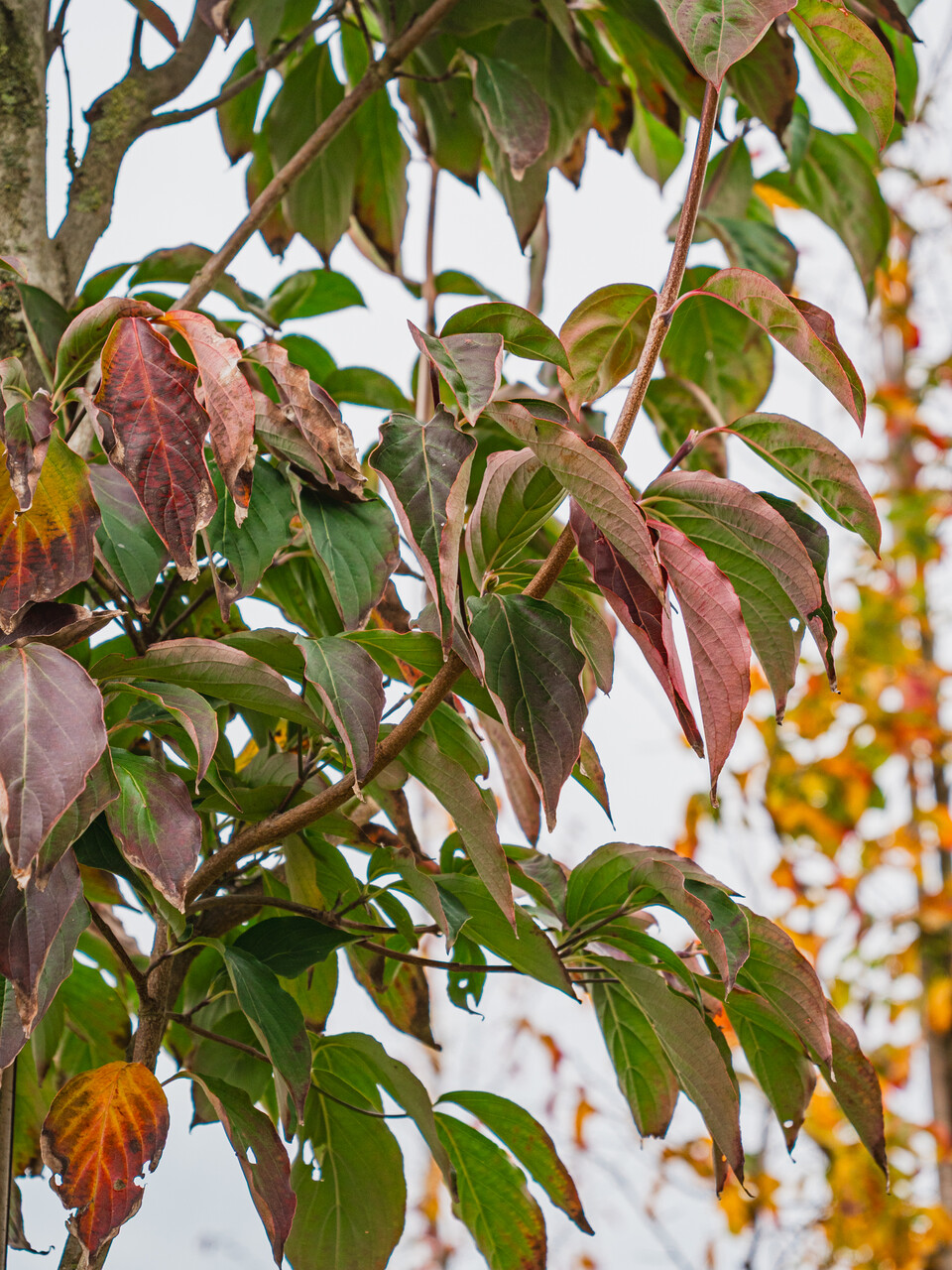 Listy stromu Cornus kousa var. chinensis se změní v žlutá, červená během podzimu.
