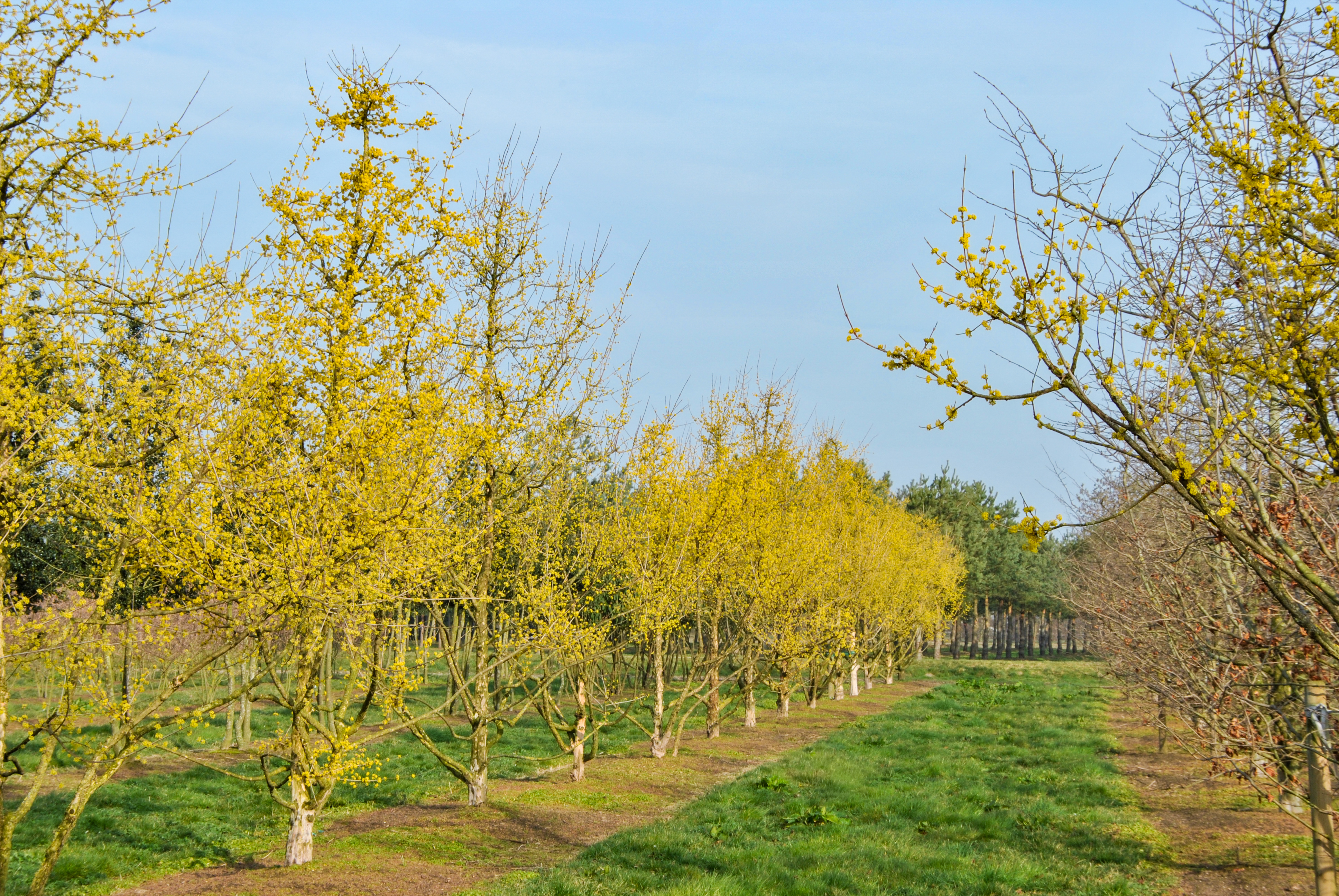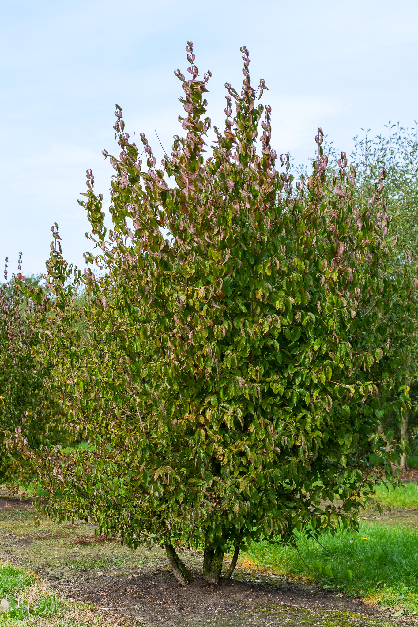 Dřín obecný, Cornus mas, je původní druh rostoucí v mnoha částech střední a jižní Evropy jako velký keř nebo vícekmenný strom s hustou, v dospělosti kulovitou korunou. Vyznačuje se pomalým růstem a dorůstá přibližně stejné šířky jako výšky. Borka starších kmenů je šedohnědá a šupinovitě se odlupuje, zatímco mladé letorosty mají zelenou barvu. Leskle zelené listy se na podzim zbarvují do žlutých až oranžovočervených odstínů. Jeho nejvýraznějším prvkem je kvetení již na konci zimy, dlouho před rašením listů, kdy je celý keř doslova obsypán drobnými žlutými květy uspořádanými v kulovitých okolících. Po odkvětu se vyvíjejí plody, které dozrávají na začátku podzimu. Jsou to oválné, leskle červené peckovice o velikosti přibližně 2 cm, známé jako dřínky. Plody visí na krátkých stopkách, jsou jedlé, s mírně nakyslou chutí, a hodí se pro výrobu džemů, šťáv či vína. Kořenový systém je hustě větvený a mělký. Nejlépe prospívá na vápenitých půdách.