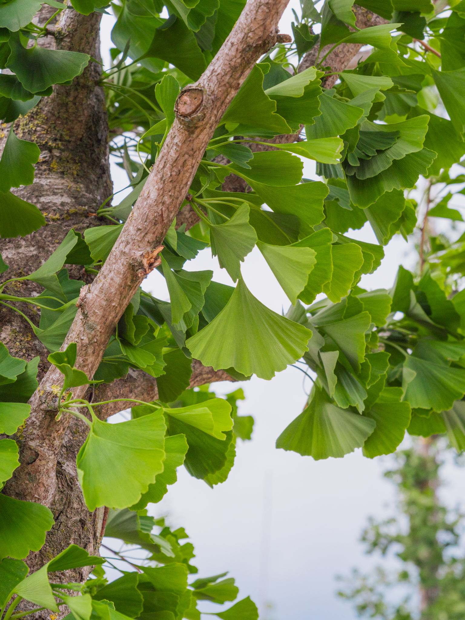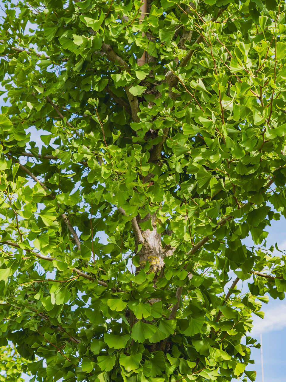 Listy stromu Ginkgo biloba FASTIGIATA BLAGON ('Blagon') se změní v žlutá během podzimu.