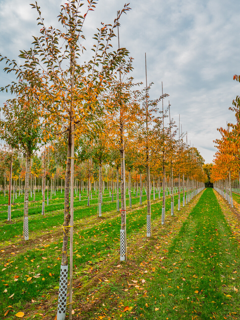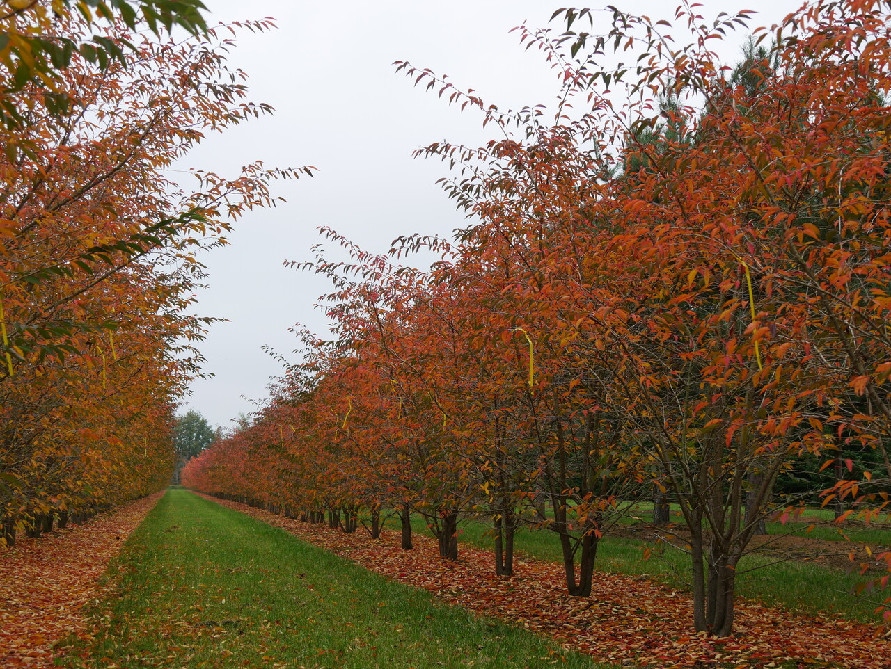 Listy stromu Prunus 'The Bride' se změní v oranžová, červená, fialová během podzimu.