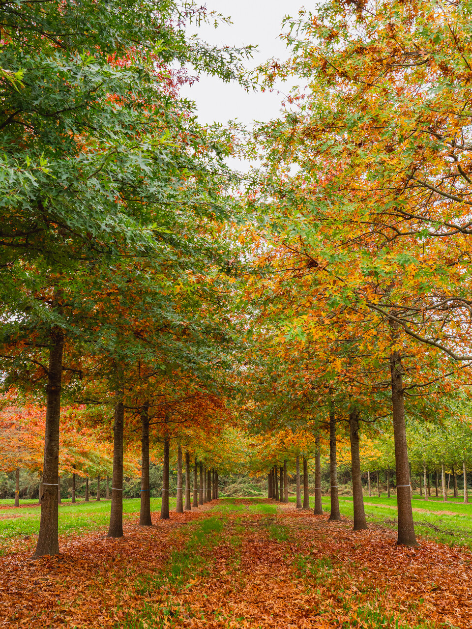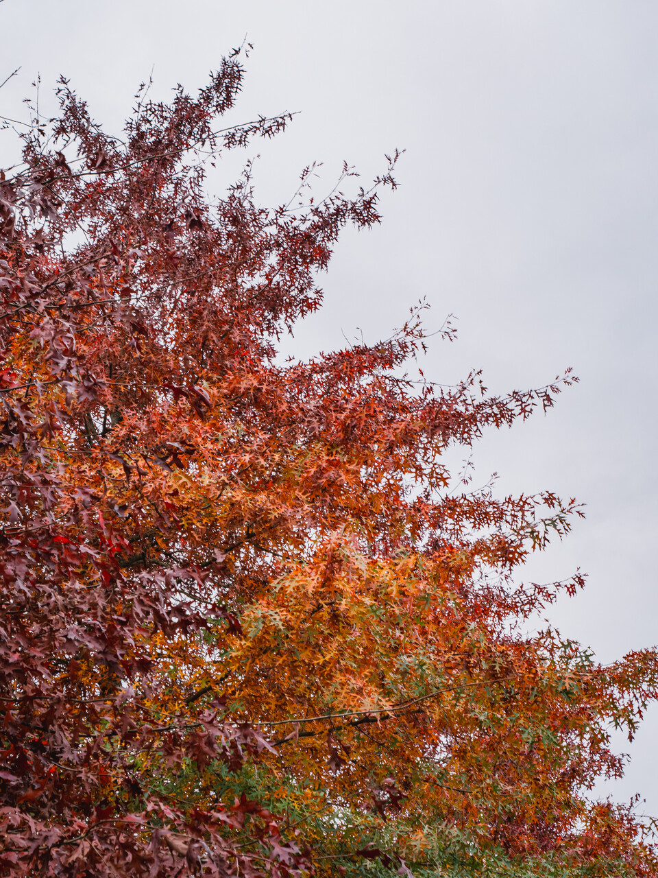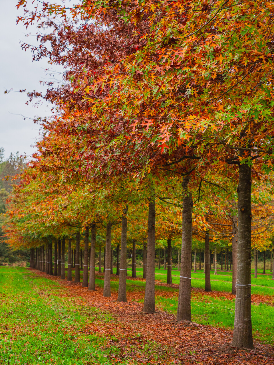 Listy stromu Quercus palustris se změní v červená během podzimu.