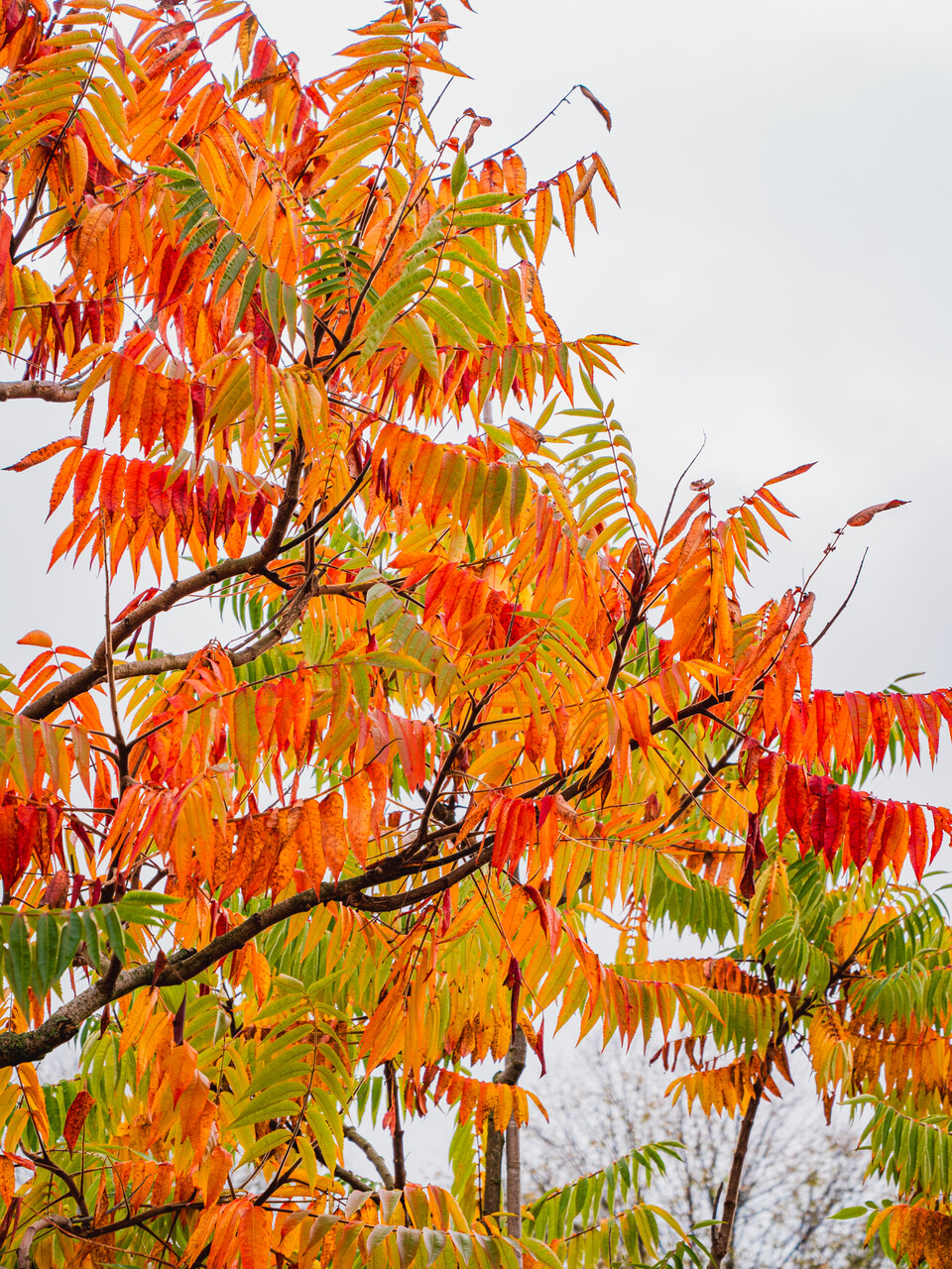 Listy stromu Rhus typhina se změní v žlutá, oranžová, červená během podzimu.