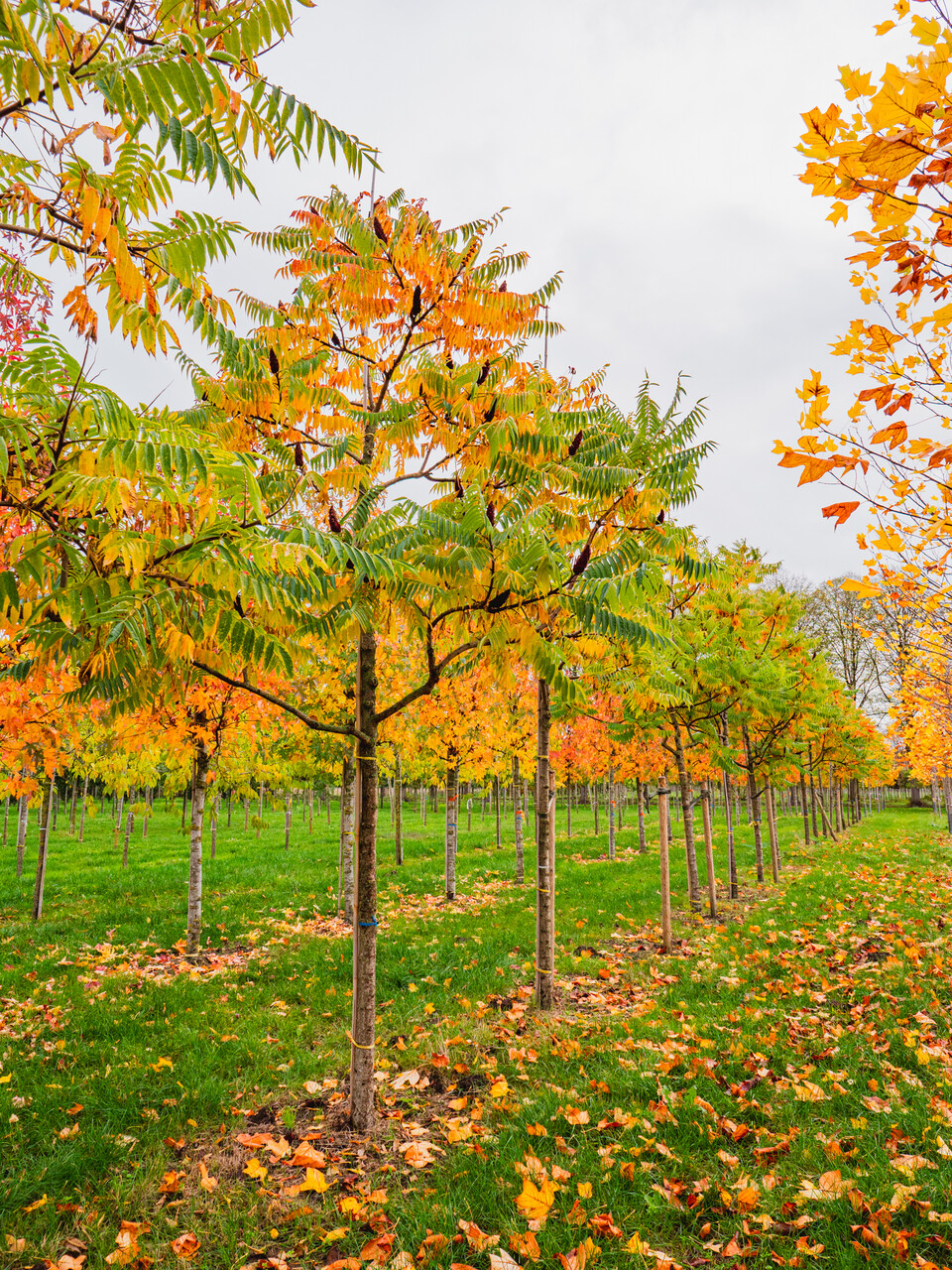 Správný čas na výsadbu stromu je mimo vegetační období. Ve střední Evropě, Rhus typhina se zemním balem může být vysazen od listopadu do pozdního dubna, nicméně toto velmi záleží na klimatických podmínkách a druhu stromu.